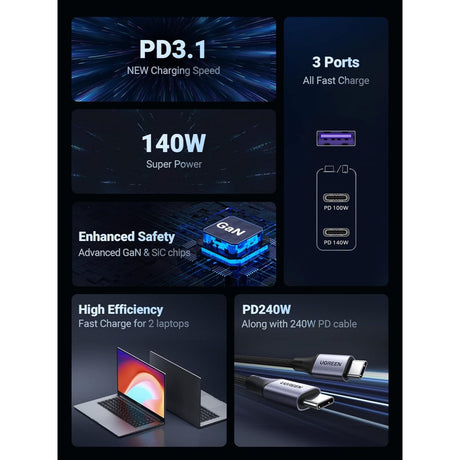 UGREEN 140W USB-C Nexode GaN Cargador PD3.1 con Cable USB-C de 1.5m
