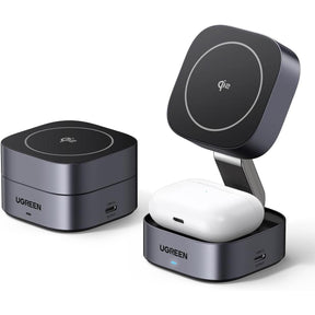 Estación de carga plegable magnética Magflow Qi2 de Ugreen, cargador inalámbrico rápido 2 en 1 compatible con iPhone 16 15 14 13 12, AirPods 3 2 Pro (sin adaptador de corriente), gris oscuro